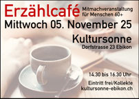 MI 05.11.25 | Erzählcafé – Lebensgeschichten Wir laden herzlich ein zum ersten Äbiker Erzählcafé! Erzählcafés sind moderierte Erzählrunden, bei denen die Lebensgeschichten und Erfahrungen der Teilnehmenden im Zentrum stehen. In angenehmer Atmosphäre wird Selbsterlebtes, was einem am Herzen liegt, erzählt. Gemeinsames Zuhören weckt eigene Erinnerungen und längst vergessen Geglaubtes kommt wieder ins Bewusstsein zurück.Das Erzählcafé bietet die Gelegenheit auf den eigenen biografischen Weg zurückzublicken sowie Gemeinsamkeiten und Unterschiede zu den anderen teilnehmenden Personen zu finden. Persönliche Erzählungen stehen im Mittelpunkt, genauso wie der wertschätzende Umgang mit den Erfahrungen der teilnehmenden Gäste. Moderation Reto Bernhard (Theatermacher, Soziokultureller Animator) Das Erzählcafé wird unterstützt durch den Verein 'Äbike helft'. Freier Eintritt, Kollekte. 14.30-16.30 Uhr. Dialog